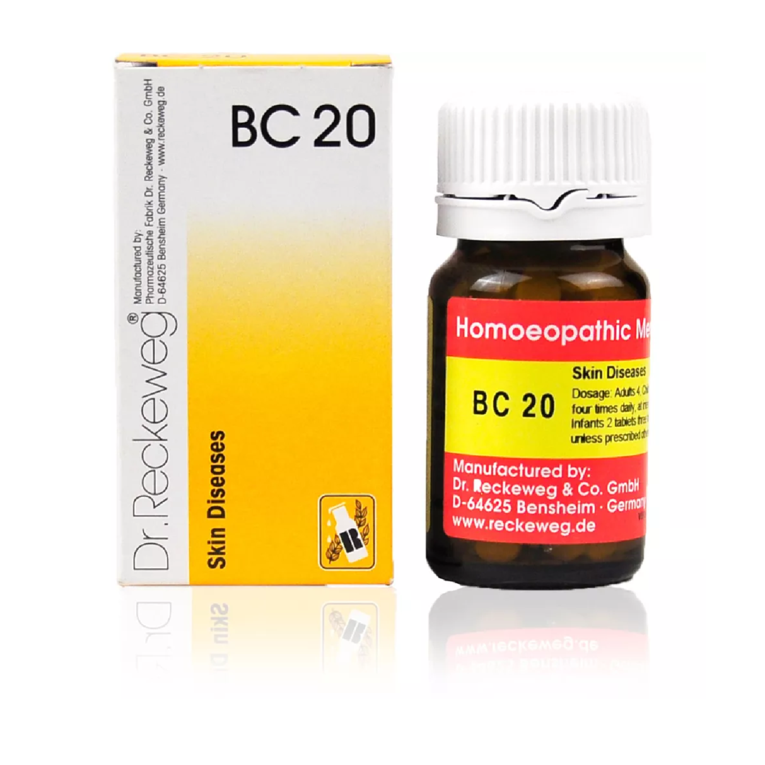 Dr. Reckeweg Bio-Combination 20 (BC 20) Tablet can help with the treatment of skin conditions like herpes and eczema. It reduces acne breakouts and pimples, aids in the treatment of scalp eruptions, and heals cracks.